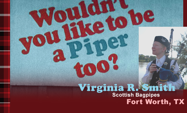 My name is Virginia Smith. I am a full-service bagpiper in Fort Worth, Texas. I teach people of all ages to play the Great Highland Bagpipe and have performed at a variety of events. I would be happy make your event special. If you are interested in bagpipe performance or bagpipe lessons, take a look around and contact me if you have any questions or if you would like to be a piper too.